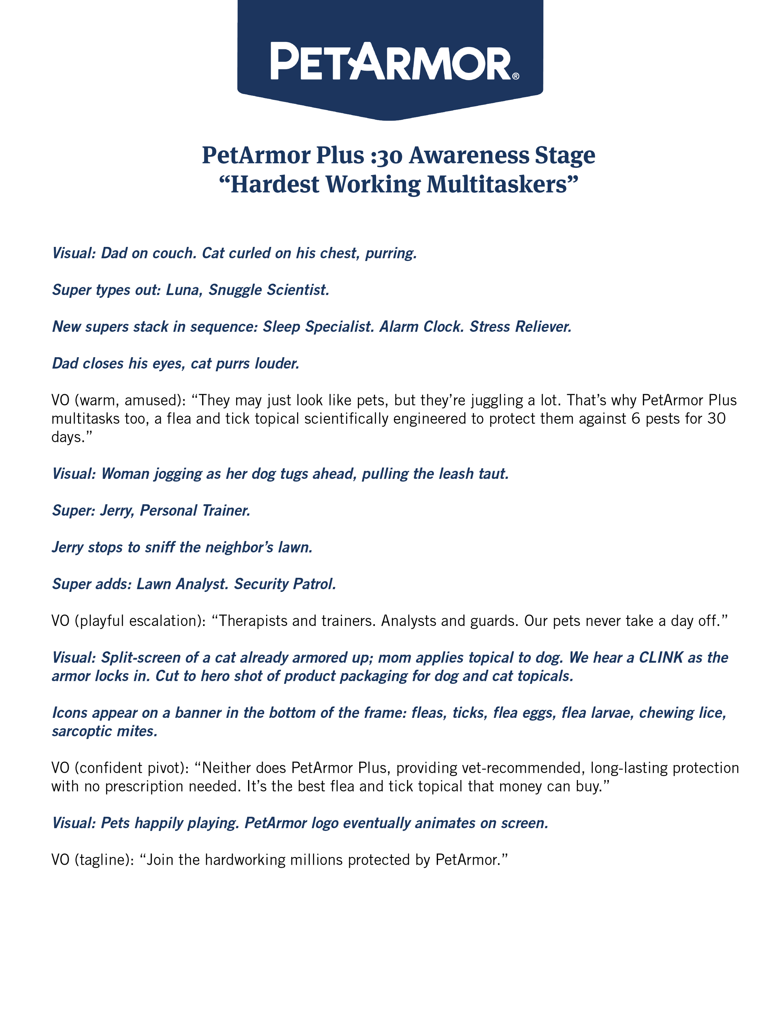 For PetArmor’s FY26 base campaign, I developed the awareness and consideration video scripts that extended the brand’s “Hardest Working Pets” platform across multiple SKUs. Working from the communications brief, I crafted a :30 awareness spot and a series of :15 consideration ads that translated strategic product personas—The Multitasker (topical), The Emergency Responder (oral), and The Double Shift (combined)—into relatable, entertaining storytelling. Each script balances humor and empathy with clear product benefits, visual iconography, and persuasive pivots to PetArmor’s key claims (vet-recommended, rapid relief, long-lasting protection). The scripts shared below demonstrate my ability to move seamlessly from strategy to creative execution, anchoring campaign messaging in consumer insight while delivering engaging, scalable video concepts for digital, broadcast, and social channels.