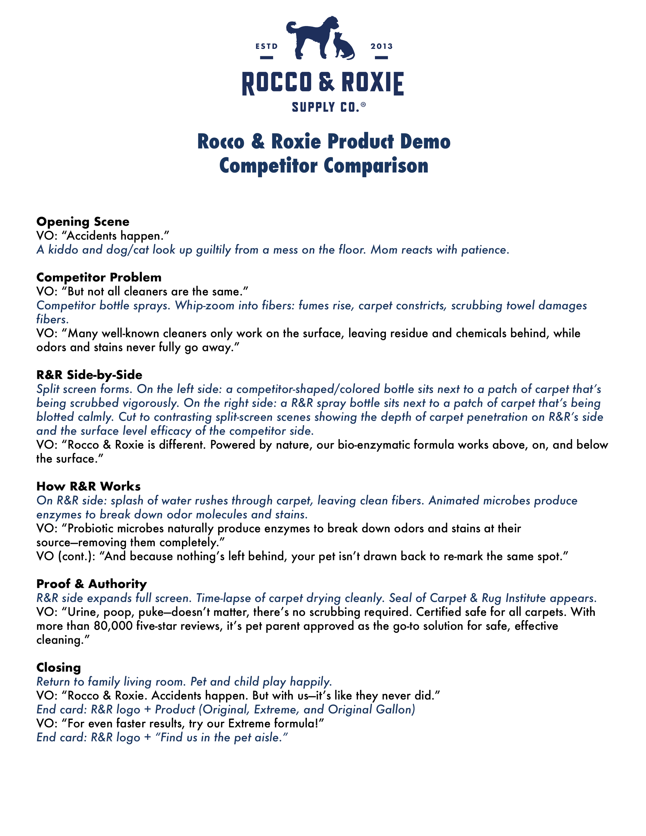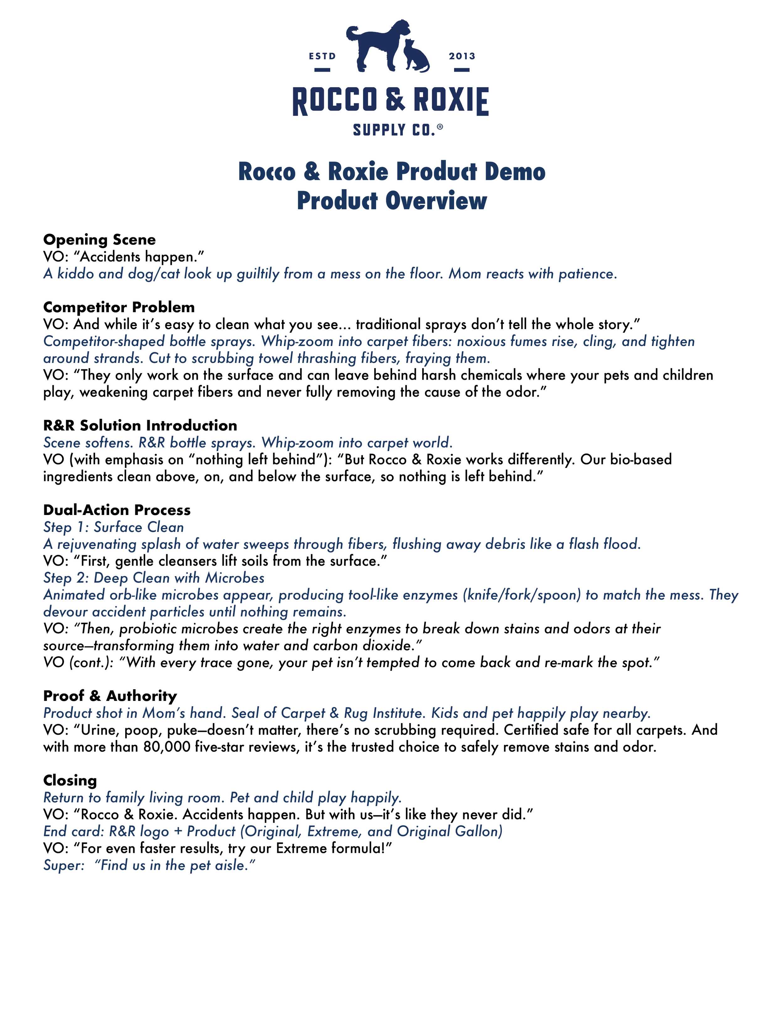 For Rocco & Roxie, I scripted two long-form product demos designed to showcase the superiority of their bio-enzymatic Stain & Odor Eliminators against traditional chemical-based cleaners like Resolve. Guided by the creative brief, I built a clear narrative arc: introducing consumer insight (“are my spaces really clean?”), dramatizing the competitor problem (residue, scrubbing, lingering odors), and visualizing the R&R solution through dynamic demonstrations of how probiotic microbes break down stains and odors at the source. Each script integrates proof points (Carpet & Rug Institute certification, 80,000+ five-star reviews, and pet parent trust) while balancing authority with approachable, family-centered storytelling. The result is a pair of versatile, 30–45 second scripts that educate, differentiate, and reassure, built to anchor e-commerce, paid media, and retail channels